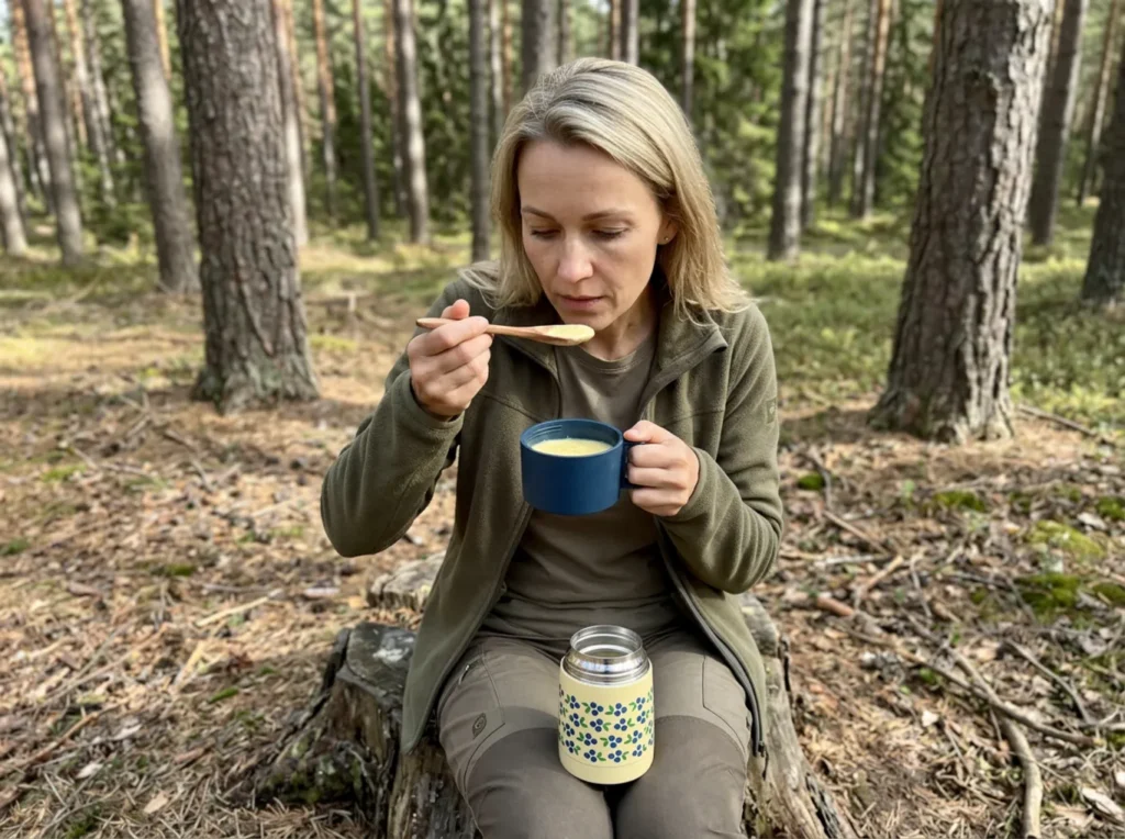 Norralased võtavad alati kaasa midagi sooja – termoses kohvi, teed, kakaod – ja natuke süüa. Looduses söömine on omaette nauding; toit maitseb väljas alati paremini. Termos käes, vaade avara metsa või mere poole – see on friluftslivi klassikaline pilt.