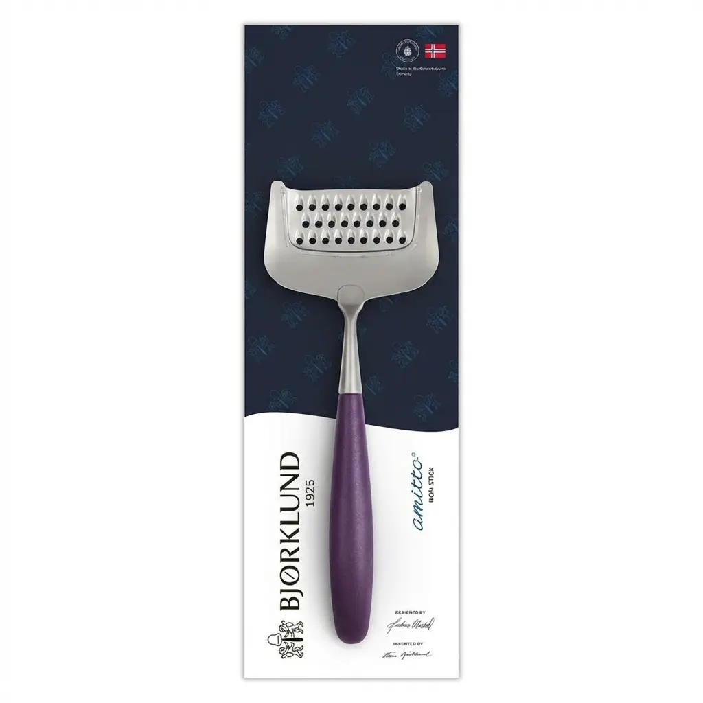 Bjørklund Amitto juusturiiv ploomivärvi käepidemega – Norra käsitöö alates 1925. Pesumasinakindel, 10a garantii. Sobib kõvadele juustudele, pastale ja pitsale.